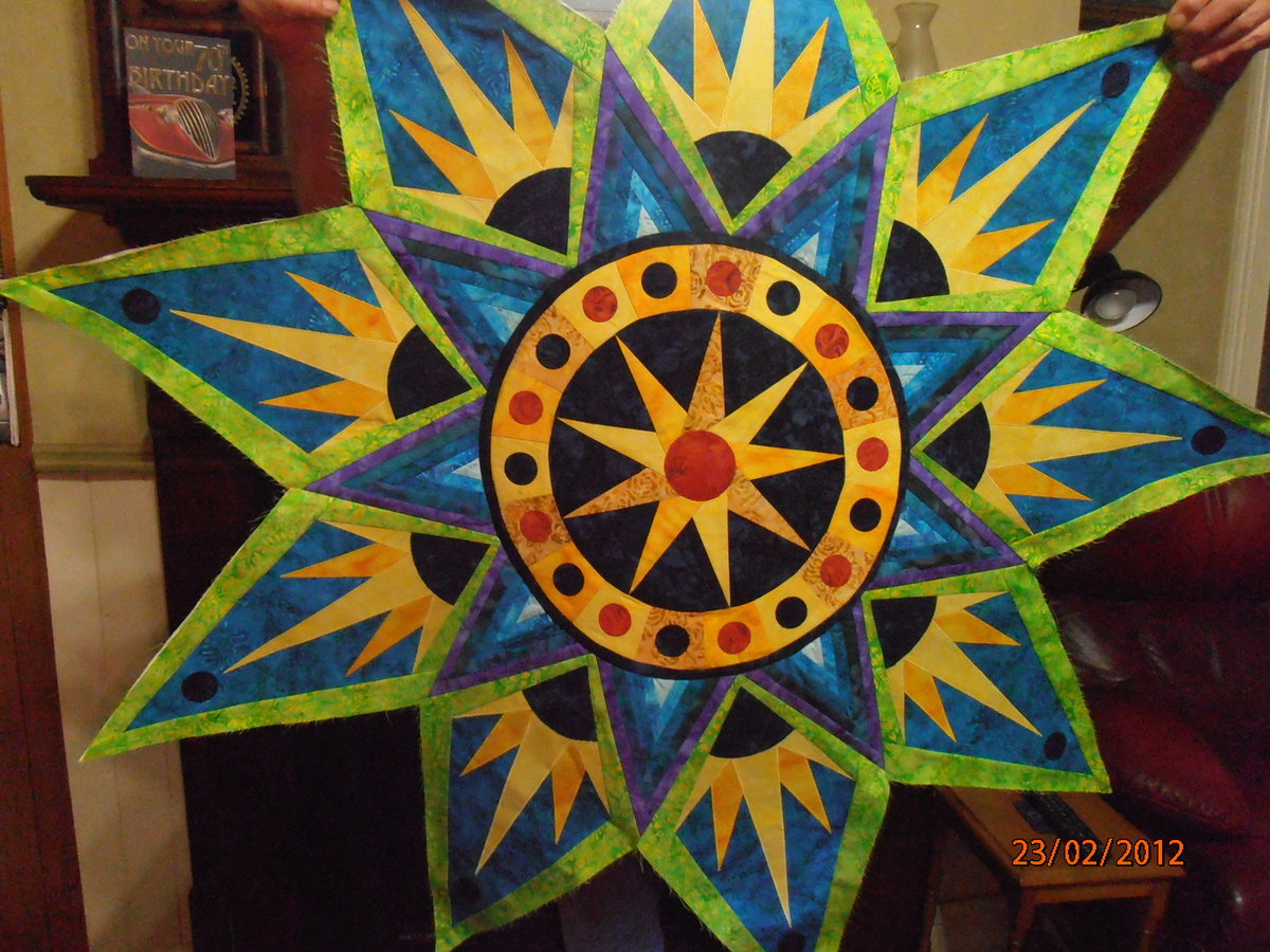 I am having a hard time fitting the month 1 circle inside the month two circle. The blue triangles end up with little gathers so it won't lie flat. My mother, an expert, says i need to adjust the month 2 circle. Apparently I, a beginner, was not careful enough attaching the blue triangles to the diamonds at the bottom points. So I am taking it apart to try again- any tips for making sure the corners of the blue triangles on the inner circle are laying right to get the correct circumference?
