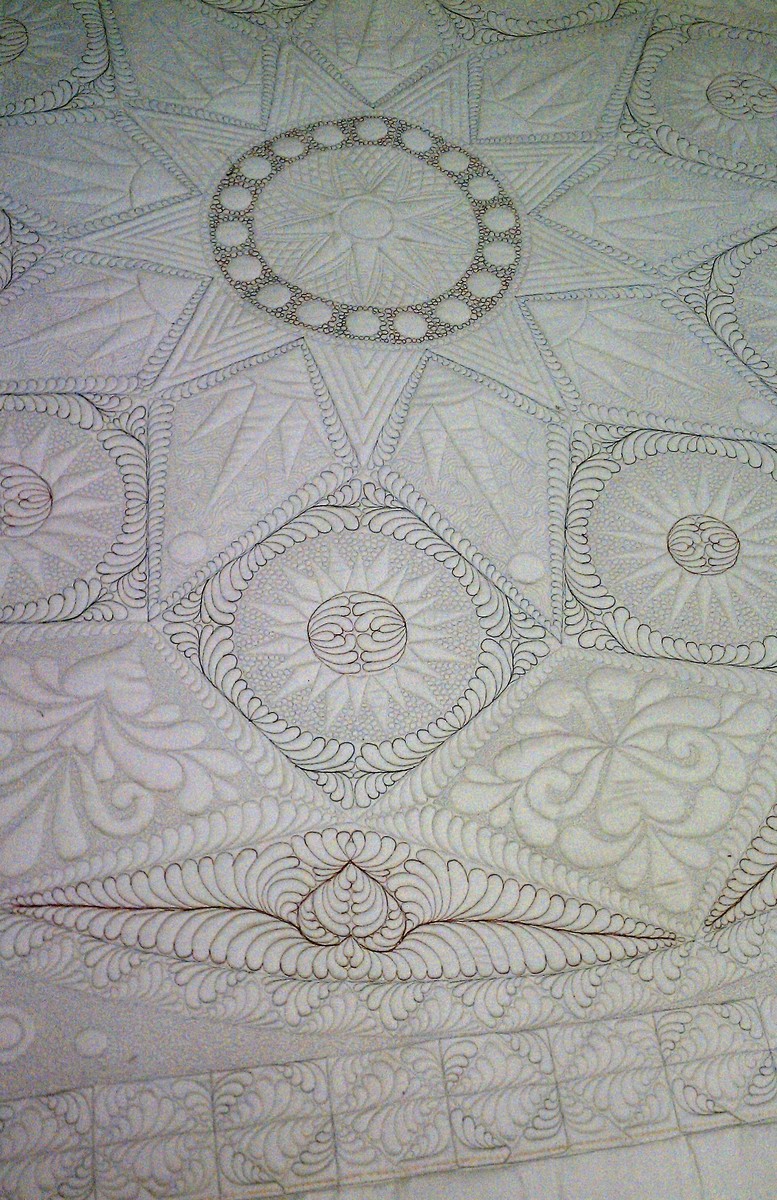 Okay, here are a couple of pictures of the back of my quilt. One of the pictures is the back when I had all of the quilting done except the settings (I was trying to figure out how to quilt them differently than I did Sarah's, it was hard to get my brain to switch gears!) and the other is when it was completely finished. They should be a pretty good starting point to get the ball rolling for the rest of you. And if you have any questions about quilting, please feel free to ask! I'm a little experienced in that area and don't mind helping at all.
