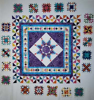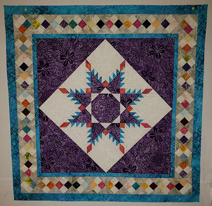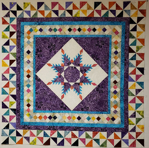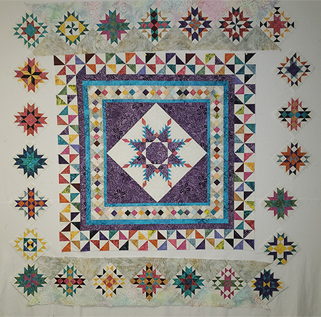 Why is it, when you are working on a quilt, you do not see something turned the wrong way until after you have sewn the next fabric to your block. I had my 6" star blocks on my wall for weeks, looked at it every day, and never noticed that I had two blocks from the last set that had parts turned the wrong way until I had the setting triangle fabric already attached, and the border sewn together. At least I didn't have the border sewn to the quilt and the next floater borders sewn on before I saw it. Here is a picture with the top and bottom borders with the setting triangles, that I shared with a few friends, and never saw any issues.