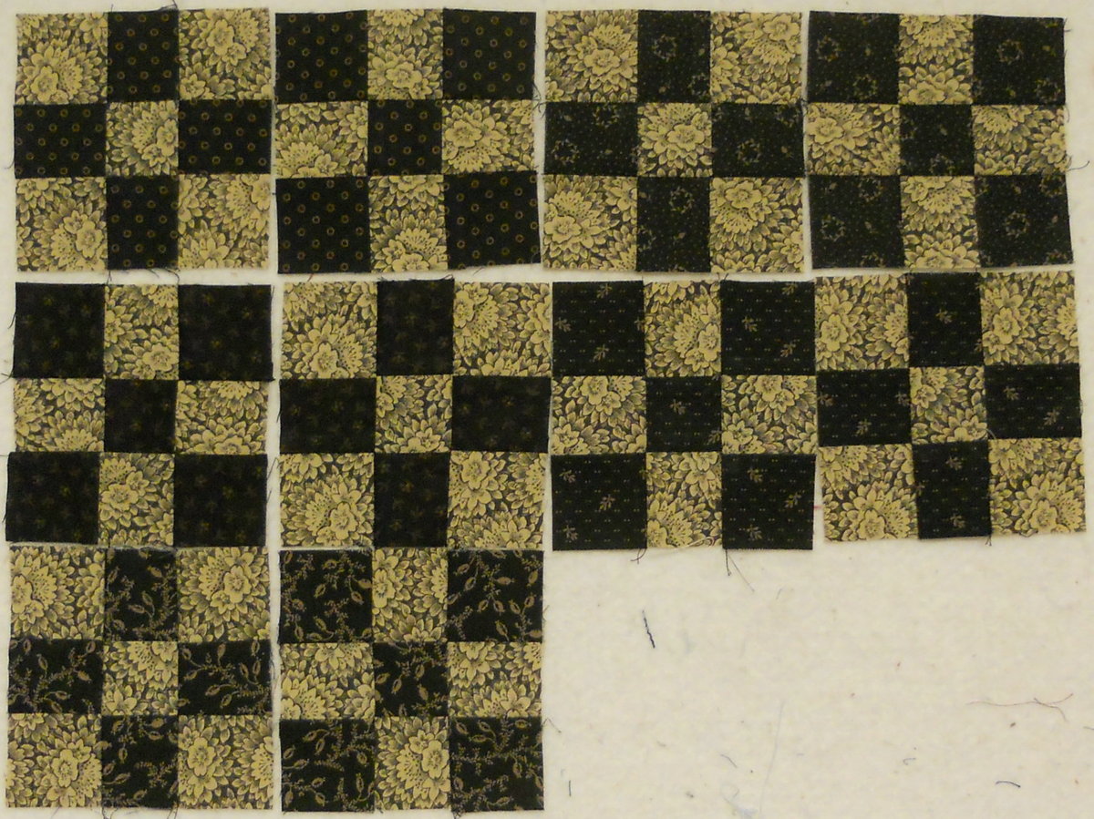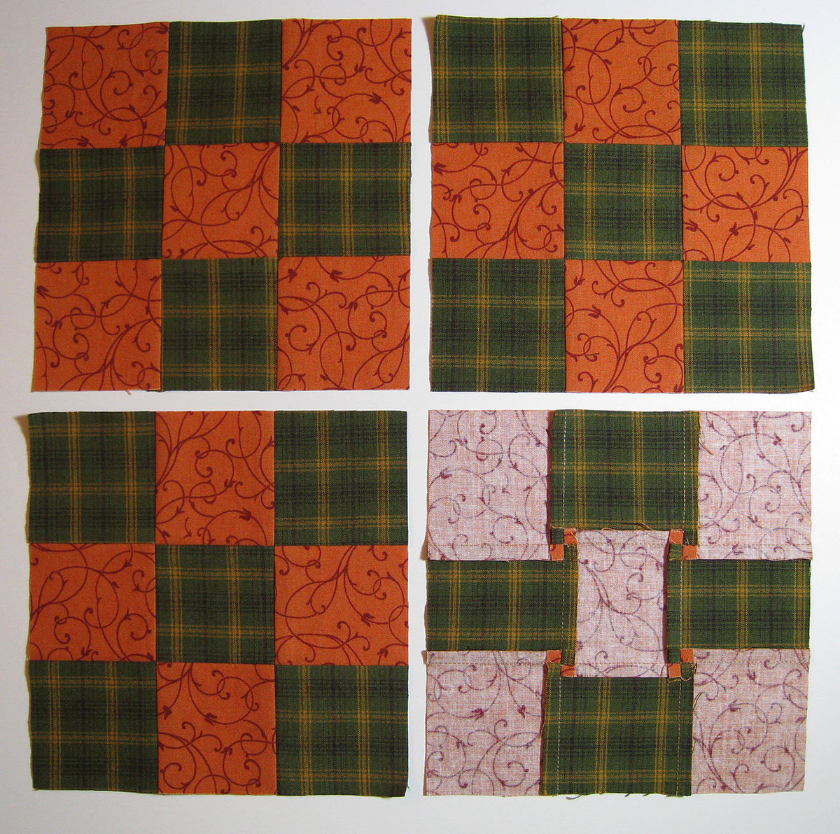 After a weekend out in the heat helping, but mostly watching my DH work, I decided I needed a day to do odds and ends. All of my calendars still say July so I'm pretending for now that's what it is. By the end of the day they will be changed and I will get back to reality. I did get motivated last night to make the 9-patch blocks. I needed 16 for my layout. Since the plaid fabric was a little heavy I decided to twirl my seams. I worked long past midnight so didn't take time to square them up until this morning. Only a sliver of fabric was removed. Usually I just leave this on, but wanted to follow at least some of the instructions. The pinwheel blocks will be easy. I will only need 8 of those which require 32 HST's. Surely I will find an hour a week to work on these blocks without having to do it in the middle of the night. I prefer late nights to early mornings as I tend to make more mistakes then.