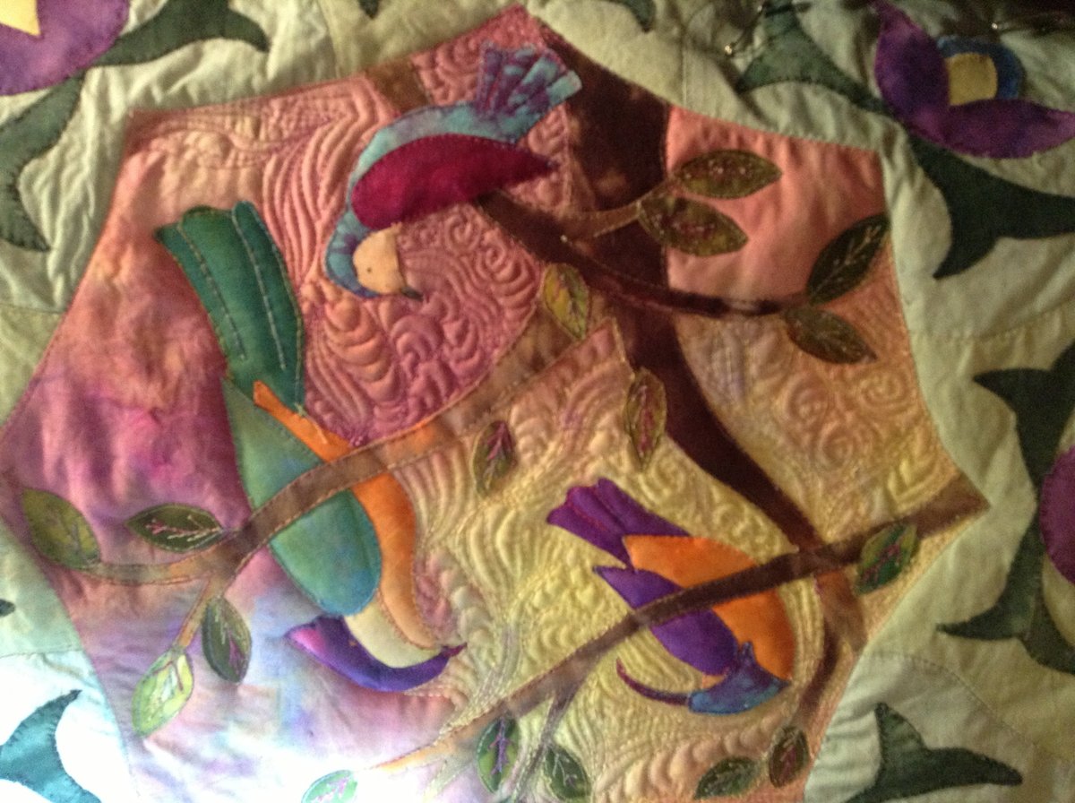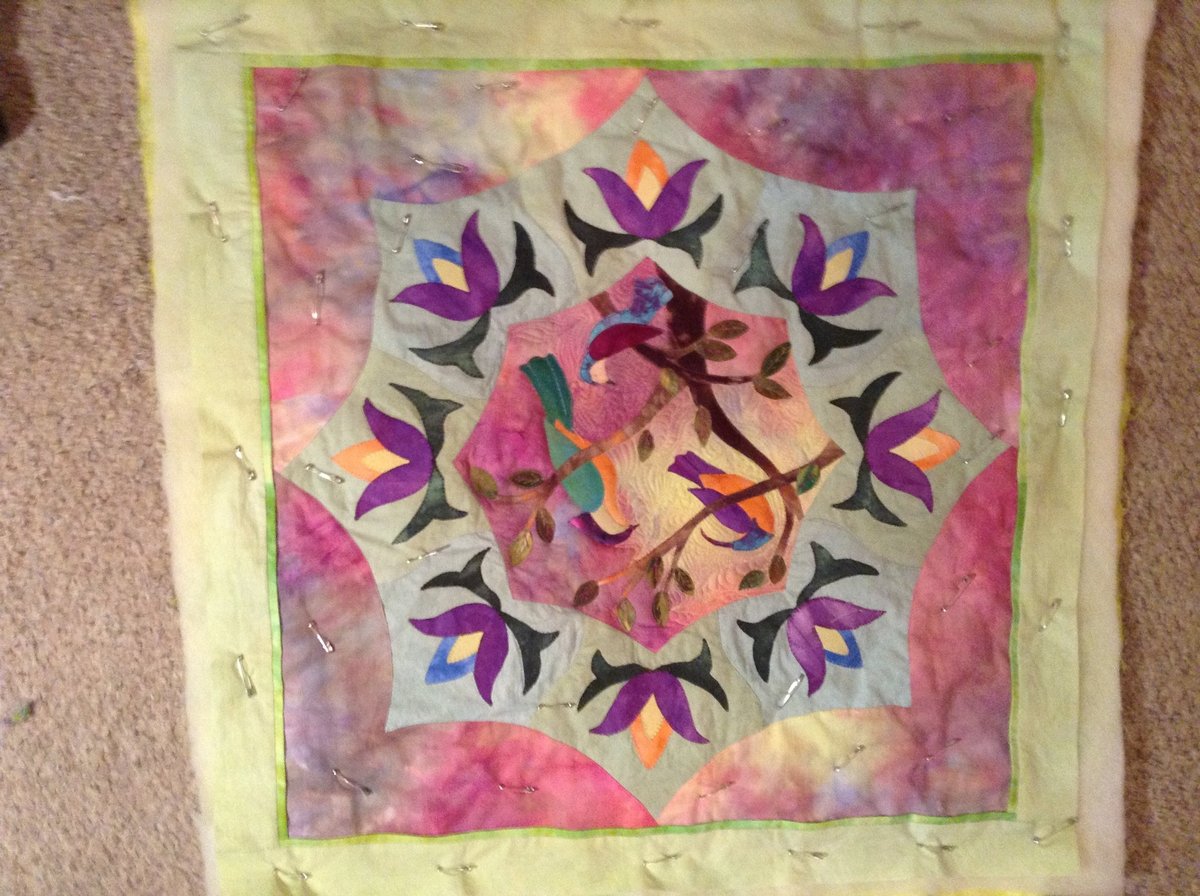 Thanks for your response Twiglet. The Pellon Lite EZ Steam II is very difficult to work with. The one side the fusible web is stuck to is thick, almost like the pressing sheet texture, can't see through it or write on it. The paper side is fine, just doesn't stick to the fusible web at all, is loose, slides all over when you are tracing and cutting out the pattern with the fabric! The fusible web ends up not stuck to anything after peeling off the thick piece, sticks to itself, pleats, folds over, etc! Just to get it onto the fabric I had to re-trace & cut 3 or 4 more pieces! Don't like it at all! I asked if anyone on facebook knew of a place to order the Warm Co Lite Steam-A-Seam 2, a friend in WA is sending some! Yea! I have all my pieces cut out, stay stitched, on my design wall, the center has all the applique ironed on. I was travelling, g'ma-ing July-September! Decided to wait to begin so I wouldn't be interrupted and hoped I would have all the SaS2! Yours looks wonderful! Once you get started, it's hard to wait for time or materials!