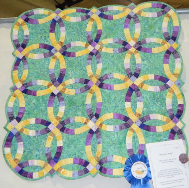 String of Rings. The rings are 9" blocks and it was a purple yellow challenge. All fabrics sent had to be represented and i could add one additional color.
