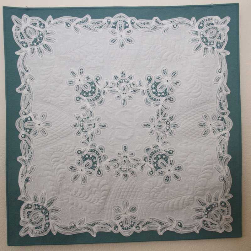 I thought you guys would like to see this linen quilt I just finished for my aunt and Godmother. She is 89 and when i go see her she loves to see my quilts, so I took a linen quilt to show her. She was so excited and asked me to quilt a linen she had purchased in Germany several years ago. Her favorite color is teal. I quilted it with Superior Kimono Silk and wonderfil in the bobbin. The silk thread sews like butter. today I delivered the quilt and she was speechless, which doesn't happen too often, hehe. I had a ball designing and quilting it, which now I would do a few things differently, but she loves it and its hanging in her front room. There is an S in the middle for their last name.