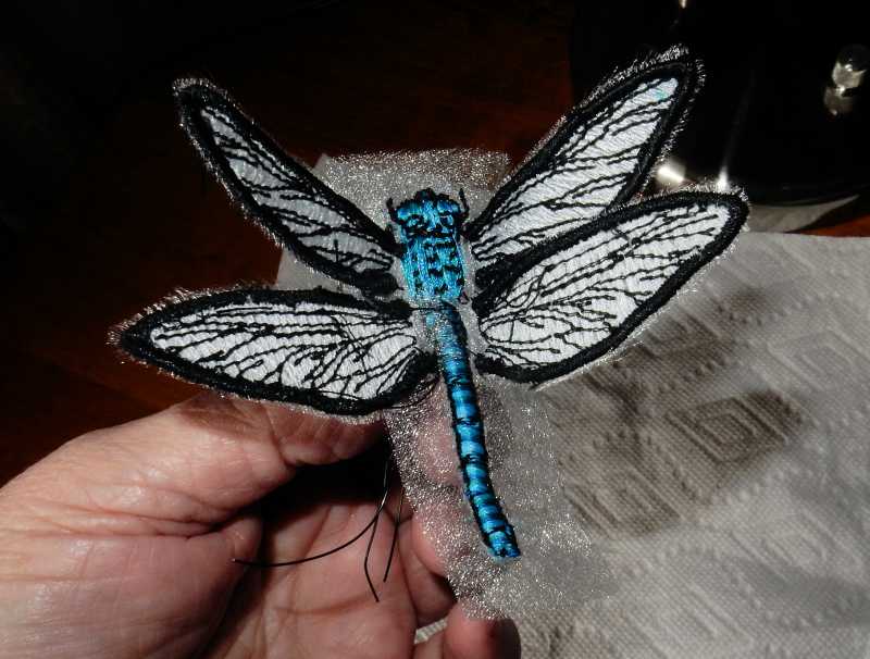 Hi everybody. I am making a couple of quilts on which I am placing wired edge 3 dimensional insects or birds. I am wondering if anyone of you out there has ever done this and if so, have you ever shipped such a quilt, or entered a show with one, or judged one? I want to enter one of these into the show circuit if it turns out, but I'm unsure how the stumpwork with wire in the wings to make them have dimension would fare in a show or shipping. Any ideas on how this might be accommodated? This picture is before I attached it to my quilt and I did some substantial embroidery work hiding the wires under the body of the dragonfly and making a firm connection to the wings to the body. It looks really cool, but I don't have a pic of that yet.