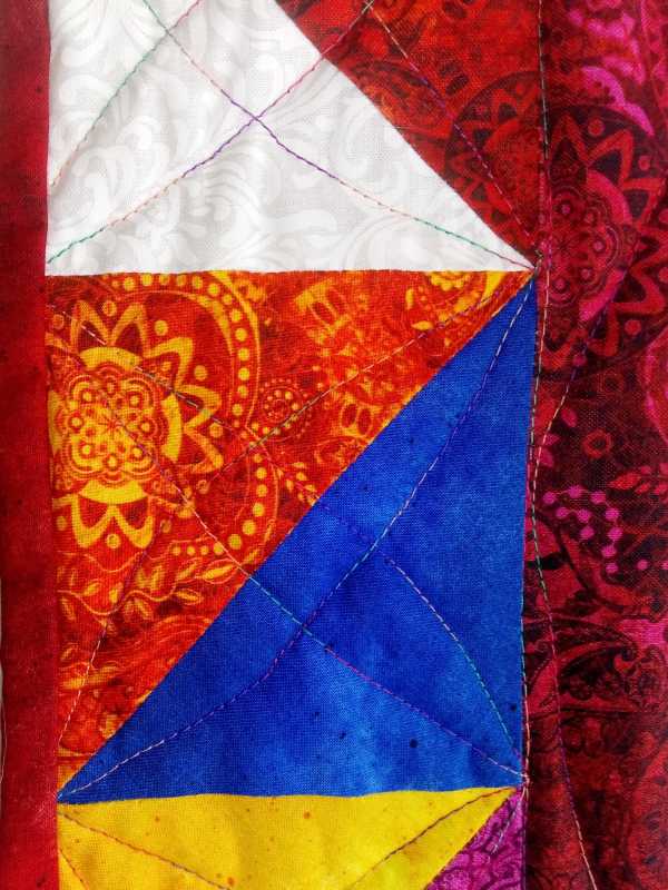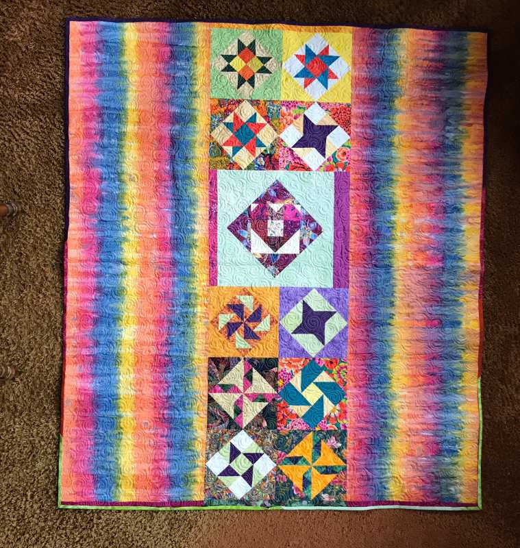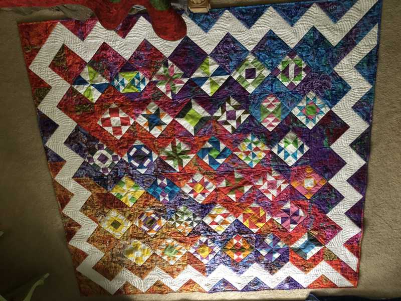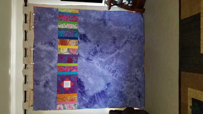 Quilted and bound. The back was made by using remaining elements and squaring up the solids. Thank you for hosting this journey.