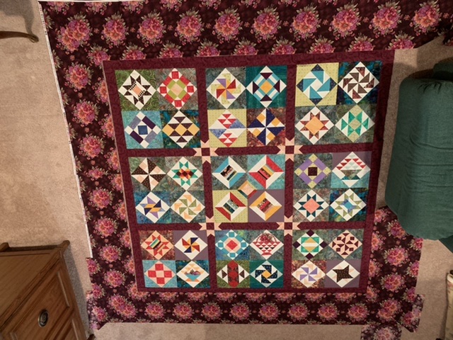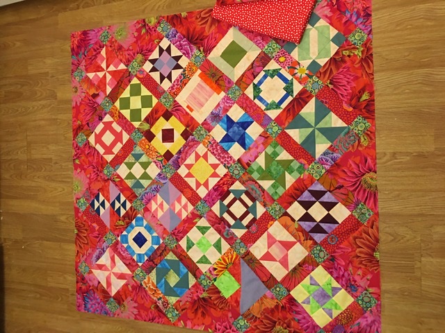 Calling it done! Like me, it’s not perfect. Quilt will finish at 48x48. The red with white dots is backing fabric.