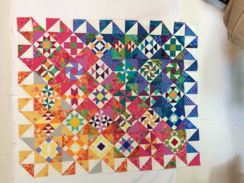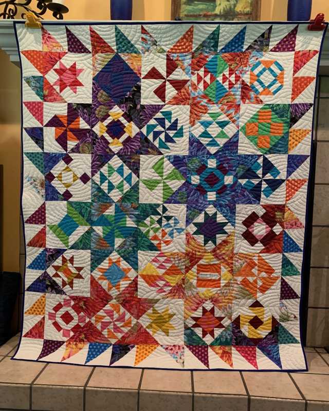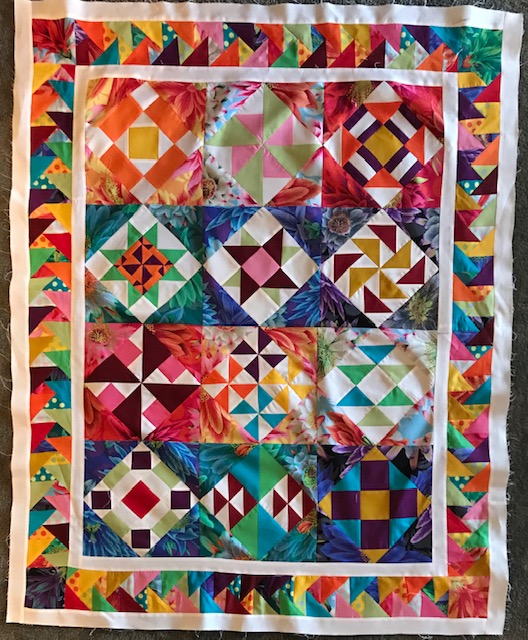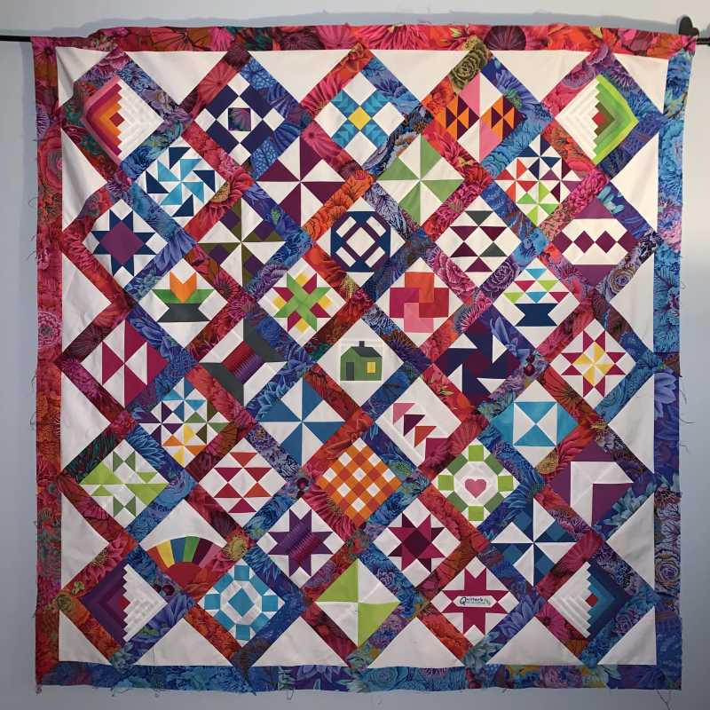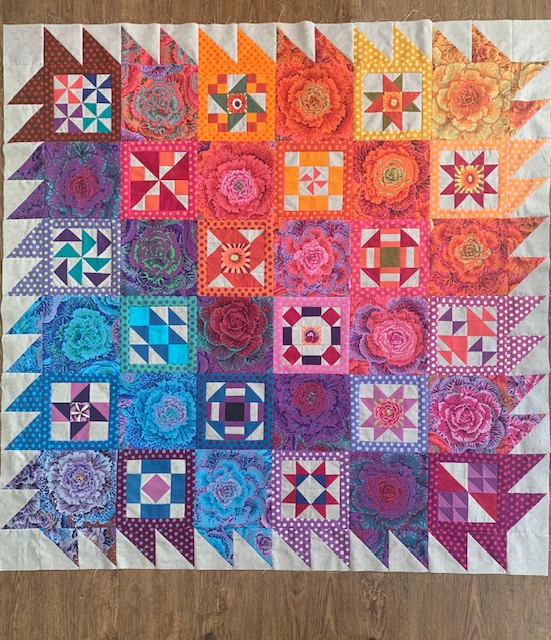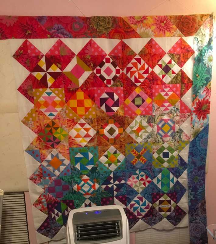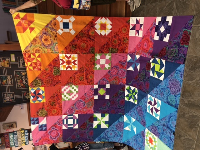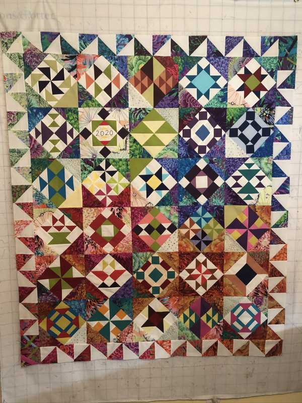 This was so much fun but very stressful at the end. I love the finished results but it stretched me way outside of my comfort zone. I like to use a pattern, know what I am making, how the colors work together and how it should turn out. Making the 6” blocks from solids which played off of the Kaffe prints was new for me and a little uncomfortable. I used color combinations I would never have used. I was doing OK until ... we got to the finishing and I felt lost on my own. Thanks to Pines for posting some possible layouts that helped me see something that would work for me. I used one of her layouts and Alex’s idea for the outside border and then the quilt it “I’m done”. I loaded it on my longarm, quilted it with a computer generated program, bound it and love it! Thank you Alex for freely giving of your time and expertise for these YouTube live Monday, Wednesday and Friday shows. It has put something routine in my non-routine life. With all of my charity quilting meetings, American Sewing Guild meetings and local quilt guild meetings cancelled until further notice I have been quilting up a storm and getting much done. This has been a bright spot in my week and I look forward to it each M, W & F. It is set aside on my calendar and only doctor’s appointments have me watching a recorded version (or the need to watch again.). You are such a blessing. I don’t do Pink and I don’t do baskets so I am thinking about how I will work the next class ... will likely do some of the baskets but in blues. It will stretch me again.