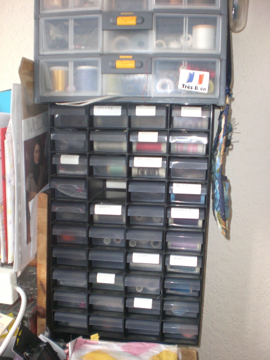 I store my thread in those little sets of drawers that are sold for keeping screws and nails in from the D-I-Y stores. If you are uncertain about which size you need, just slip a couple of your spools in your pocket and you can check in store which they fit.