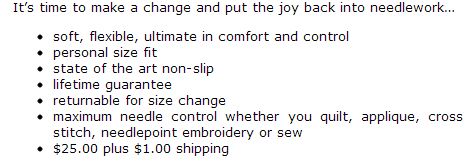 They do look interesting - I would like to try one sometime - perhaps they will come to the K&S show in November here. I cant use any of the other kinds of thimbles because I never learned when I was young. But I do use a leather one all the time and I find the flexibility of it to be great. It also doesn't slip off my finger.