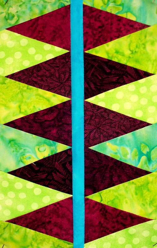 In retrospect, however, I would really urge Alex, John and the staff to consider sending enough fabric to allow people to cut their triangle strips 3 1/2" wide and made my cutting template 2 1/2" on the bottom horizontal. If you do that, you don't have to notch or anything. You just line up the tips of the triangles, center them over the paper strip and and stitch away, trimming each piece with the Add-a-Quarter ruler as Margo recommends. It goes very quickly, and you NEVER come up short. At the end, you trim away about 18 to 1/4 inch of "stuff" around each edge, and VOILA! And you can use those same triangles on the end pieces, so you don't have to cut a separate template for those ends.
