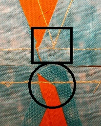 In this example, you can see the back of my completed unit. The square surrounds the side done with paper piecing and the circle surrounds the one done with the Striplate method.