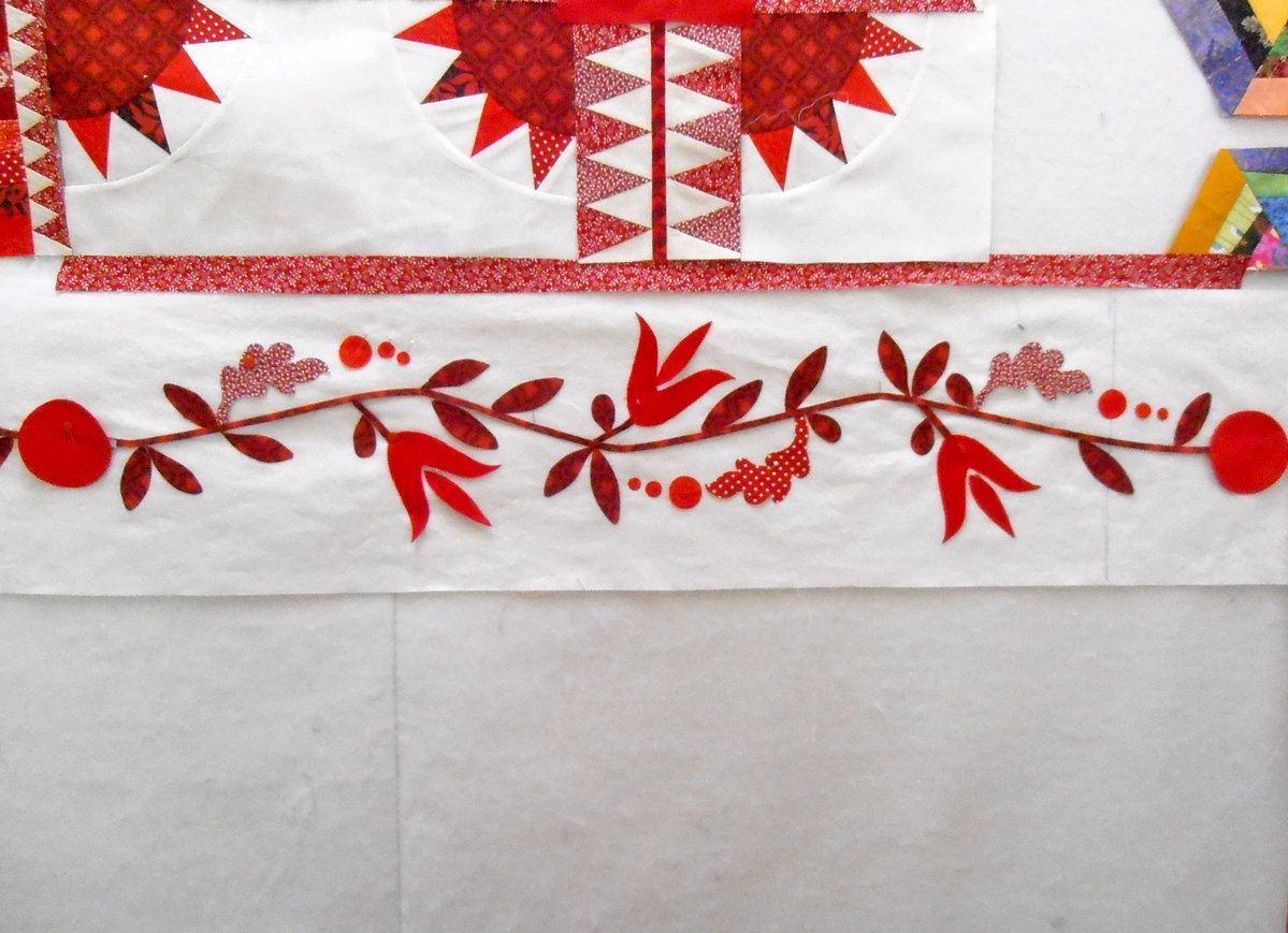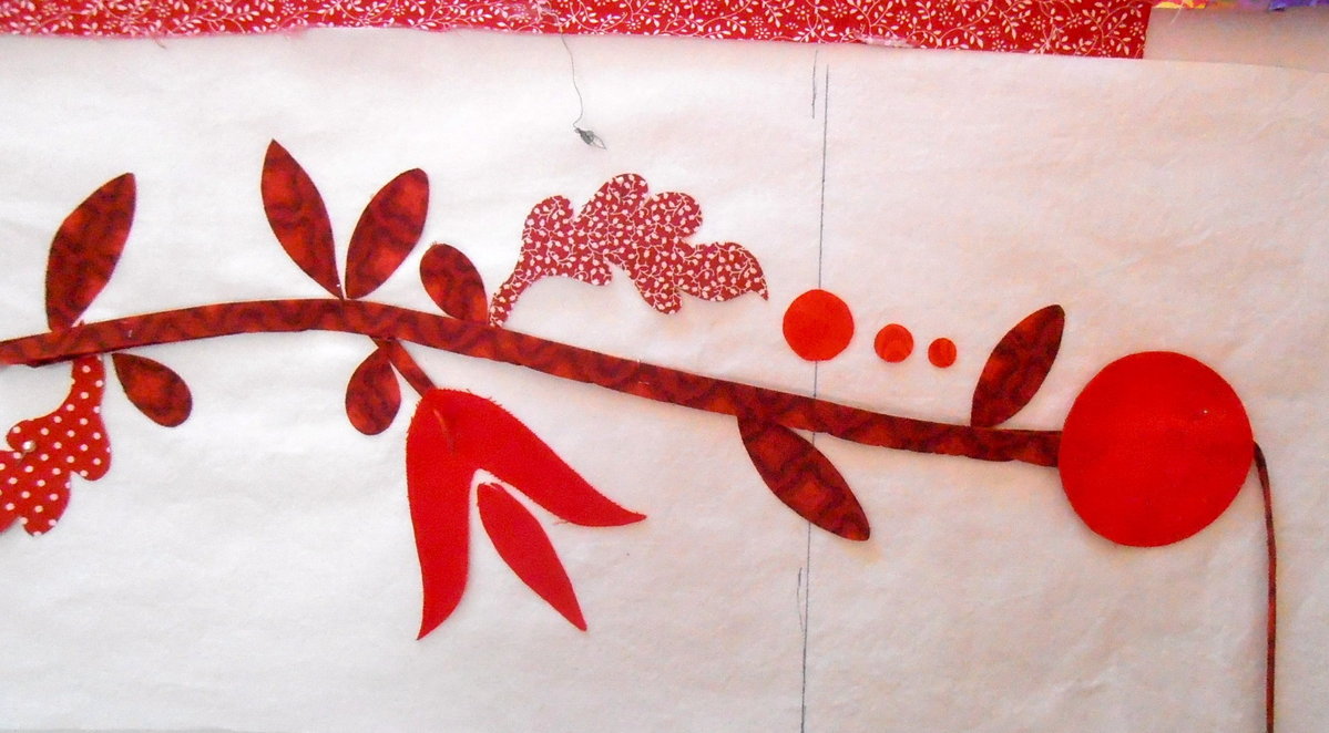 ) since you seem to have all the leaves etc already cut out, if you are doing the stem from bias strip, cut it a bit longer, wiggle it from end to end to correspond with the original design, but slightly stretch the curves (not the bias!) to fit your new length. Then place the leaves etc down but again slightly stretched out with a bit more space between them - or if you think the gaps a bit too big cut an extra one or two leaves and shuffle things up to fit them in.