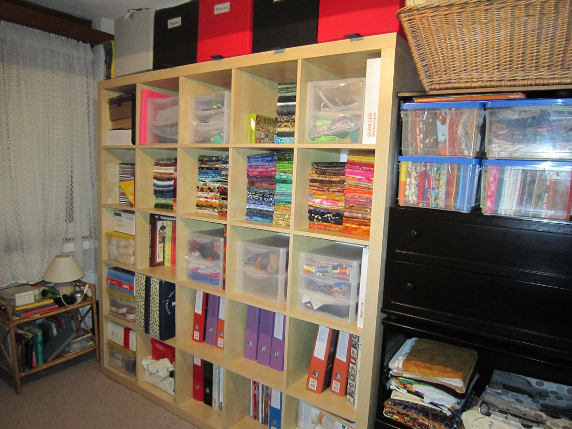 I folded all my fabrics using Margo's folding method (not all seen in the photo by the way) and I even put little labels on which tell me how much fabric is there so that I don't have to unfold them to see what's there.