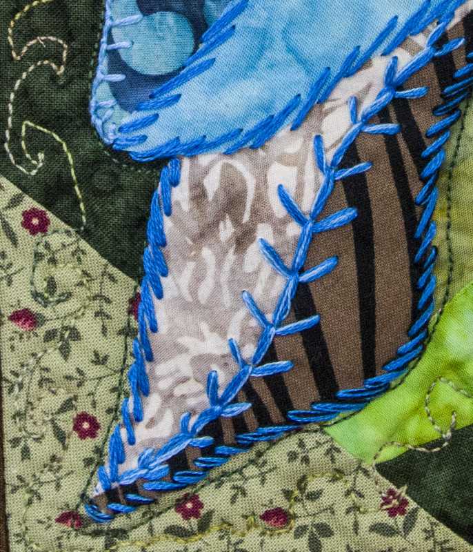 Thank you, Ann, for your kind words. I like very much this project. I am glad to tell you and all other people something about. So, concerning the blue butterflies : I used hand embroidery a bit different each other because I don't like to make things exactly the same way. Yellow butterfly: I tried a machine decorative stitch couching a yarn. I enjoy that experience. Excuse-me Ann not have made the back ground like yours. Much difficult for me. I used the crazy technique, but I promise you (and myself...) to try your technique in future days!