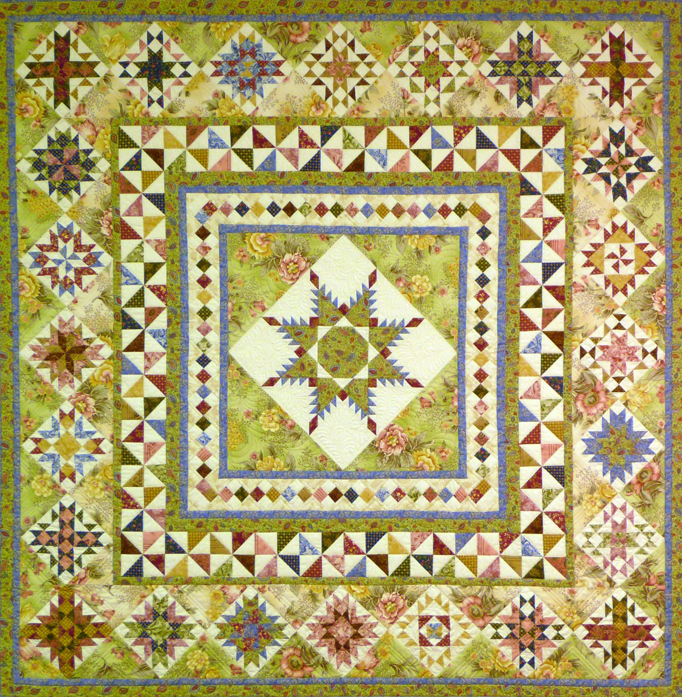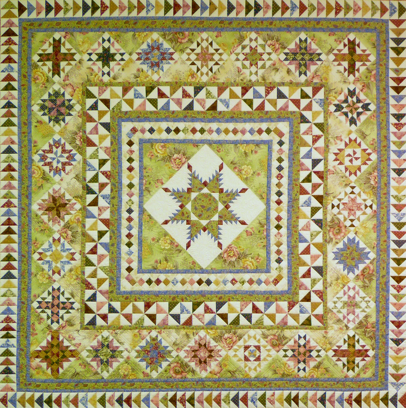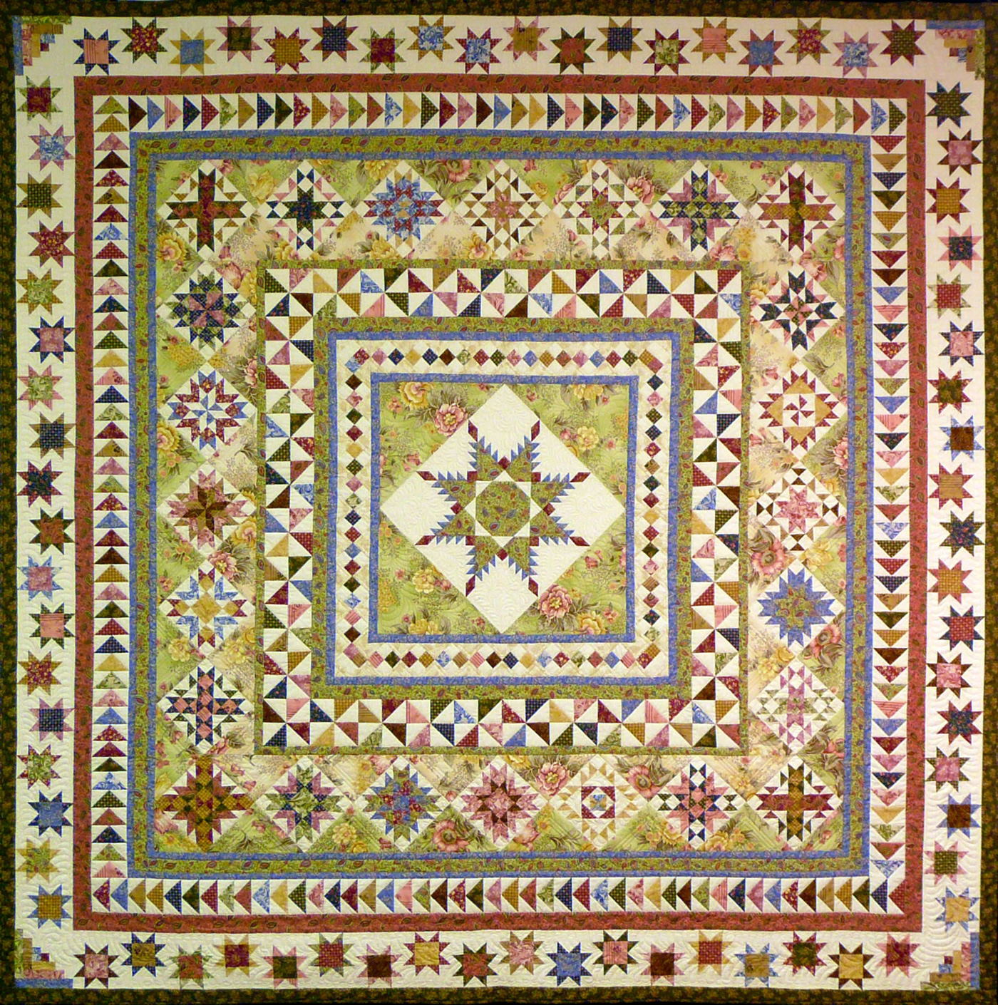 | Oh my! Finally, finally, you will get to add a new set of borders to your quilt top. This month, you will add a floater border to your quilt and then, with your border star blocks set on point, you will add your border star blocks to the quilt. Suddenly, the size of your quilt will begin to grow again. |