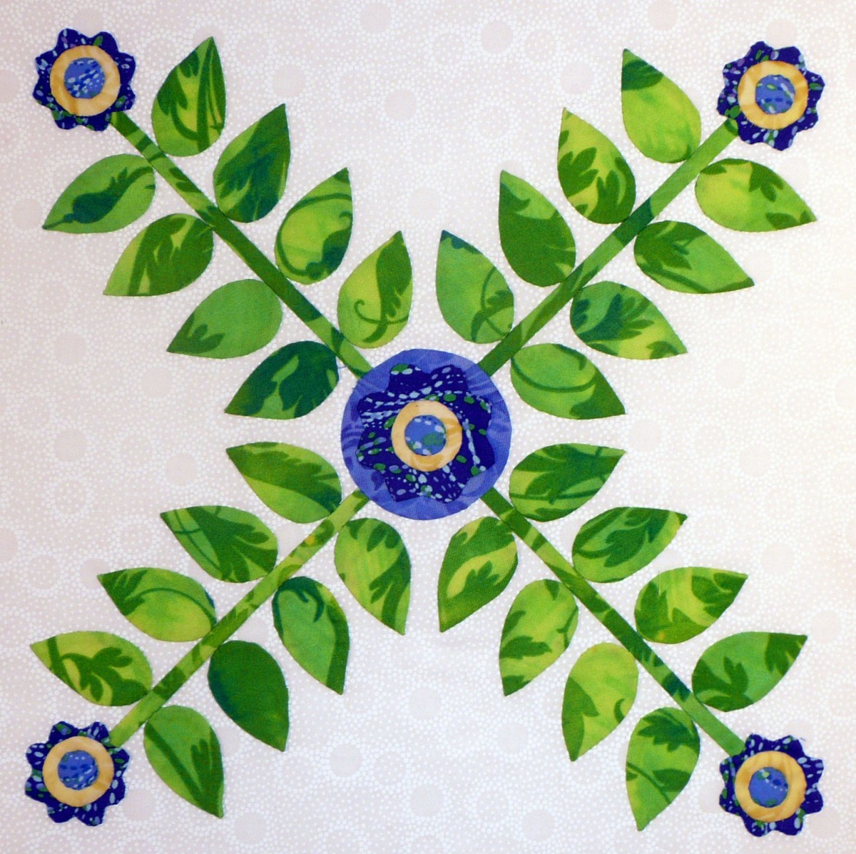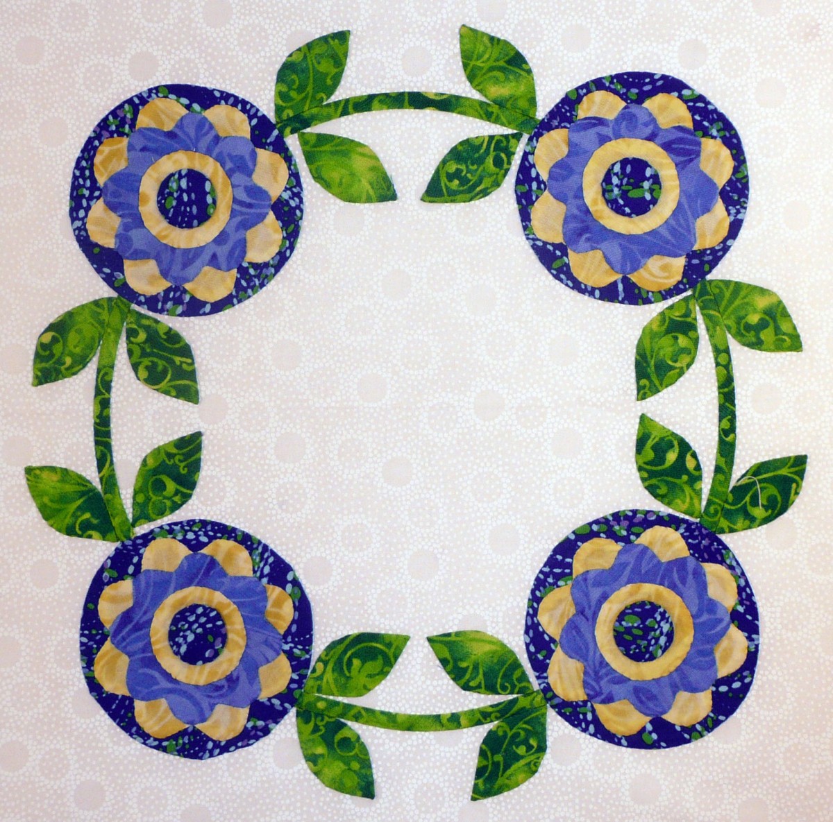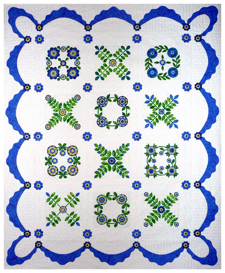 "Simple Crossed Leaves" Hugs and Kisses has a dozen appliqued blocks in it, surrounded by a ruffled swag border. Half of the blocks are crossed leaf sprays that employ applique motifs in the shape of an "X," and half of the blocks are wreaths that use applique motifs in the shape of an "O." The use of X's and O's in writing have come to symbolize hugs and kisses - but why? Early Christians used the X as an indication of a sworn oath; later, the X was used as a signature by persons who couldn't read or write, with the implication that it was also an indication of a sworn oath. Sometimes, the X was kissed, signifying its importance on a document. According to the Oxford English Dictionary, the earliest use of "XXX" for kisses was in a 1901 letter. On the other hand, the "O" used in the XOXO of "hugs and kisses," is an American tradition. The O reportedly represents the encircling arms of a hug. In truth, I'm not sure if any of these stories are based on fact. Nonetheless, the symbolism of X's and O's for hugs and kisses exists today, and through this quilt, I send everyone the joy of a warm and friendly hug and kiss!