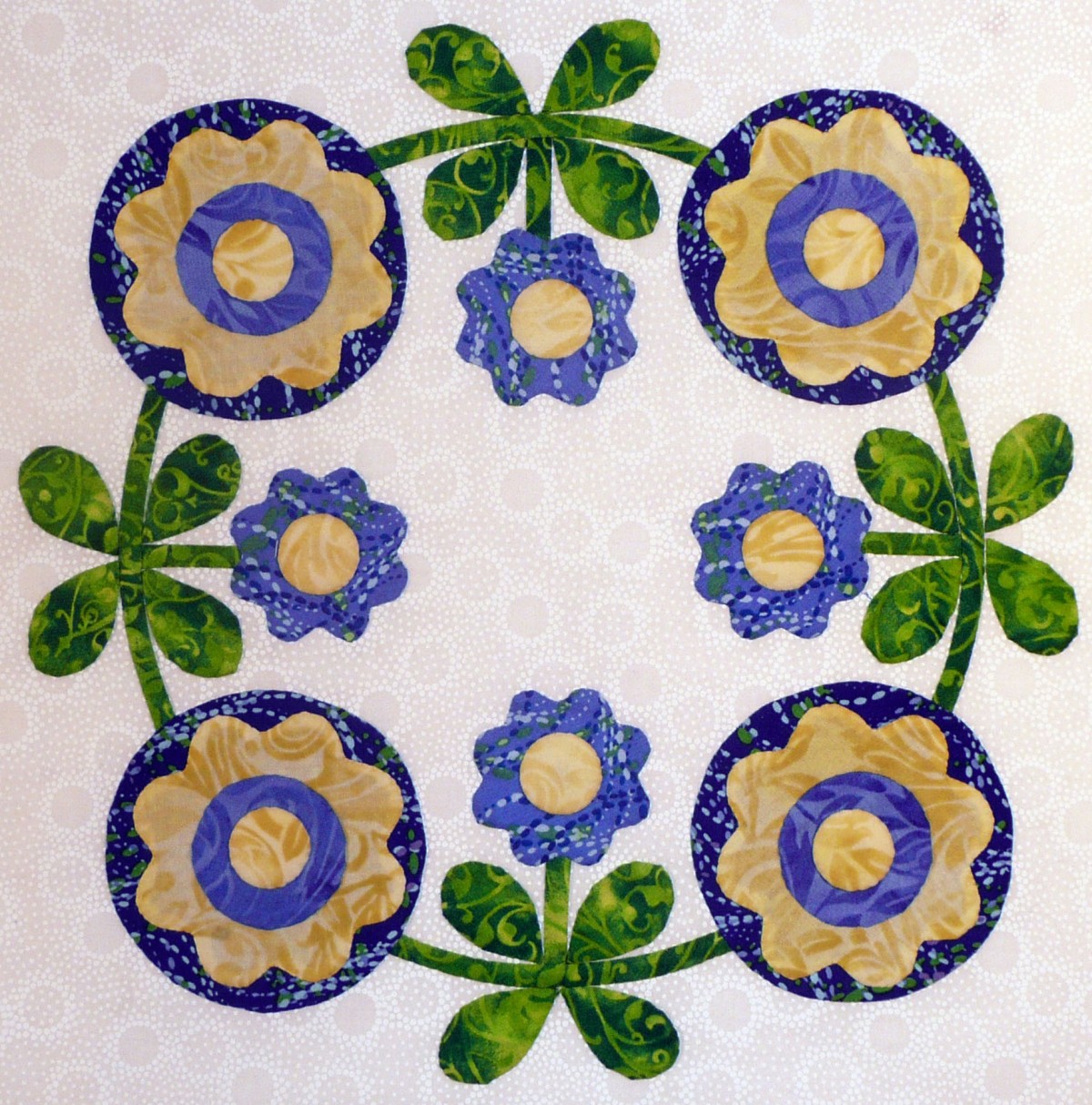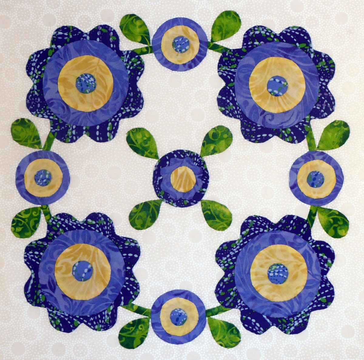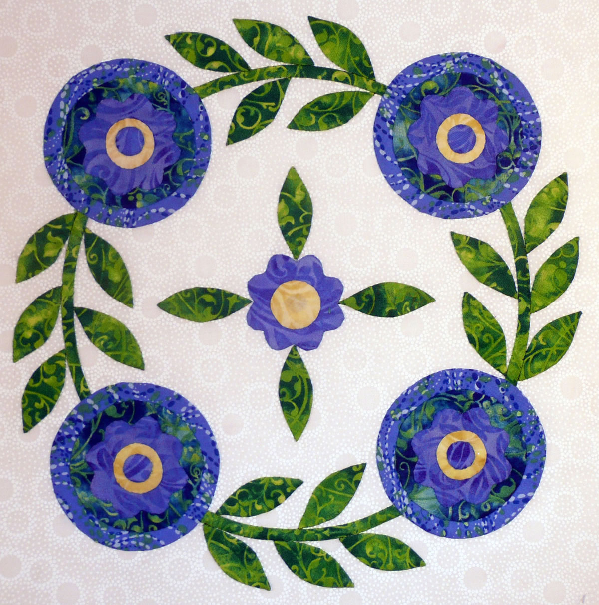 "Simple Crossed Leaves" Hugs and Kisses has a dozen appliqued blocks in it, surrounded by a ruffled swag border. Half of the blocks are crossed leaf sprays that employ applique motifs in the shape of an "X," and half of the blocks are wreaths that use applique motifs in the shape of an "O." The use of X's and O's in writing have come to symbolize hugs and kisses - but why? Early Christians used the X as an indication of a sworn oath; later, the X was used as a signature by persons who couldn't read or write, with the implication that it was also an indication of a sworn oath. Sometimes, the X was kissed, signifying its importance on a document. According to the Oxford English Dictionary, the earliest use of "XXX" for kisses was in a 1901 letter. On the other hand, the "O" used in the XOXO of "hugs and kisses," is an American tradition. The O reportedly represents the encircling arms of a hug. In truth, I'm not sure if any of these stories are based on fact. Nonetheless, the symbolism of X's and O's for hugs and kisses exists today, and through this quilt, I send everyone the joy of a warm and friendly hug and kiss!