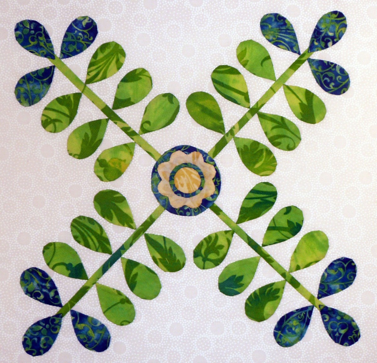 "Crossed Leaves" At the center of this month's spray of crossed leaves is a yellow rose. In yesteryears, yellow roses were thought to symbolize unfaithfulness. The meaning probably arose from the yellow rose itself: it has no scent and does not flourish with either extreme care or neglect. The yellow rose has special meaning to the people of Texas. Legend has it that the "Yellow Rose," a young woman held prisoner by General Santa Ana, commander of the Mexican forces, seduced the General just prior to the battle of San Jacinto in 1836. Caught with his pants down, General Santa Ana could not lead his forces into battle. His adversary, General Sam Houston, won the Battle of San Jacinto, just outside of Houston, in short order: in 18 minutes, over 700 Mexican soldiers were killed, 730 were taken prisoner, and only 9 Texans died. The victory led to Texas' declaration of independence from Mexico and the establishment of The Republic of Texas as a sovereign nation. While the legend of the Yellow Rose has been generally debunked, it nonetheless makes for a great tale. But that's enough history for a while; let's make our own history and finish this block in short order!