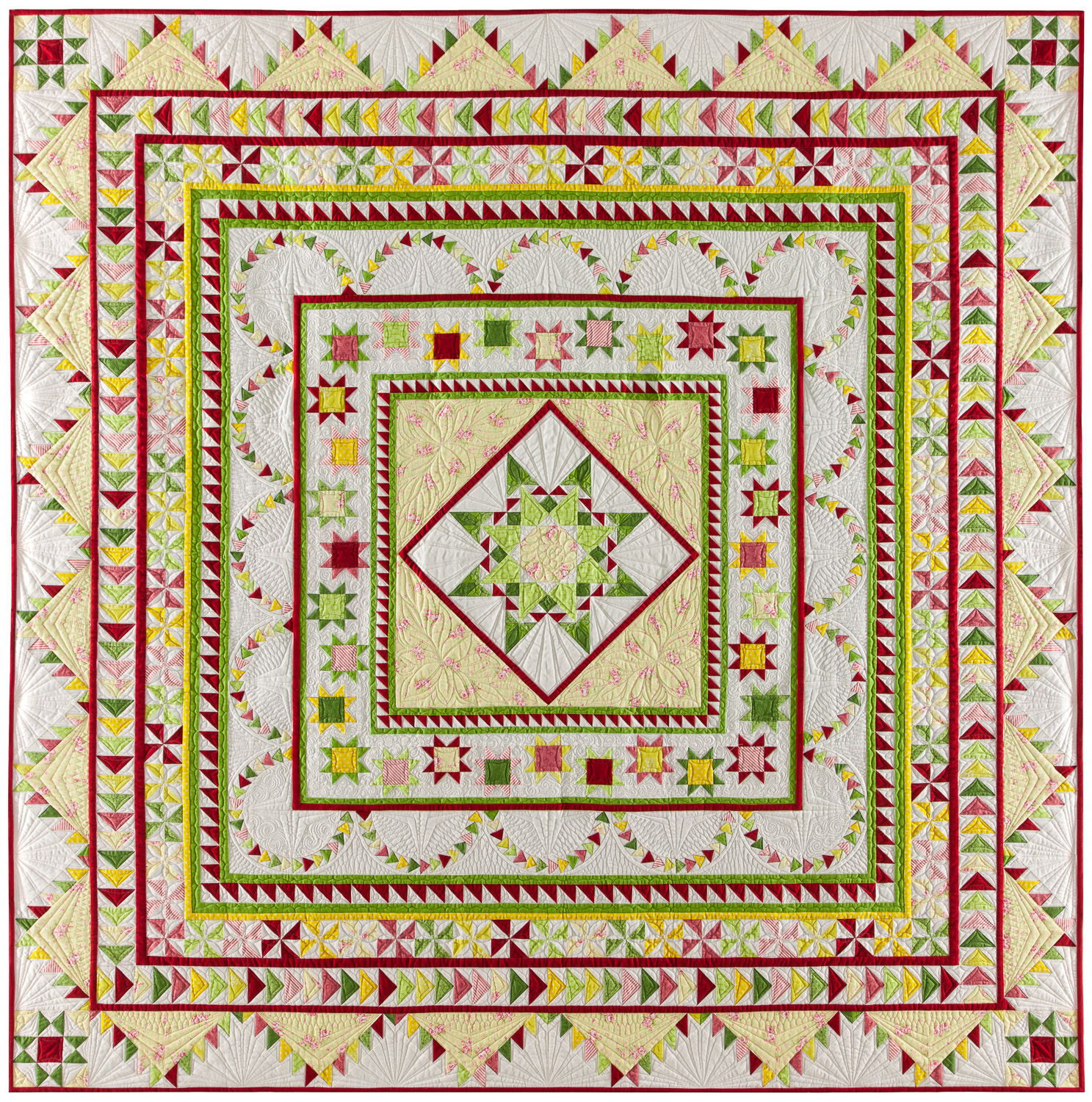Join us on a new 12-month journey as we bring you bring you another spectacular quilt designed especially for TQS by Sue Garman (click here to learn more about Sue). The 2017 TQS BOM Halo Medallion Quilt features a stunning variation of a feathered star surrounded by multiple scrappy borders. As icing on the cake she has included flying geese rings and delectable mountain blocks. Once again Sue has created a quilt for you that is sure to be a family heirloom in your home.