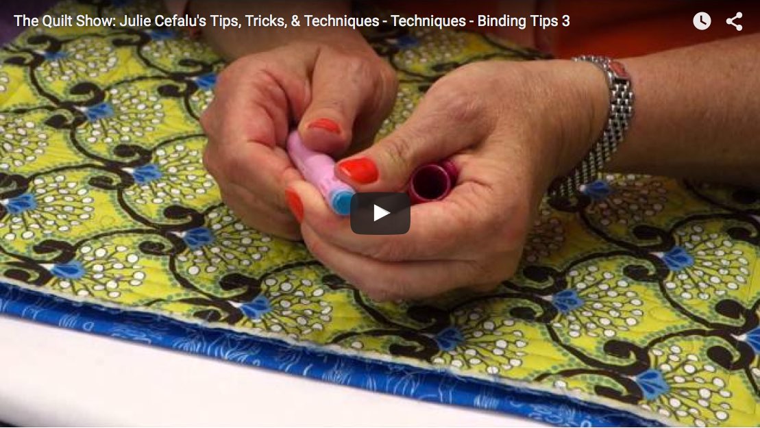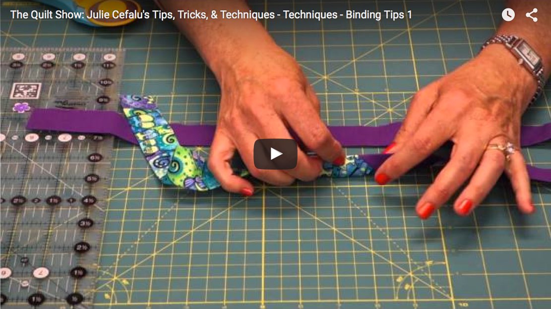 Posts On: August 17, 2015In this class Julie will show you how to prepare your quilt for binding, how to prepare your binding, determining where to start your binding on your quilt, and how to join the ends of your binding. A special tip for creating a perfect mitered corner is icing on the cake.
