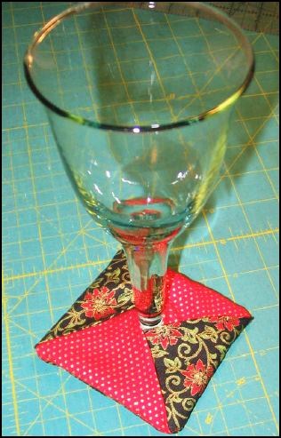Description: Here is a fast and fun holiday project that you can make in just a few minutes! These ‘slippers’ are designed to cover the stem of a wineglass so they have a ‘built-in’ coaster. Perfect for parties where your guests wander around with their drinks; they’ll prevent those rings on your good coffee table when things get boisterous! Make a set with different fabrics and they can be used as glass identifiers too.