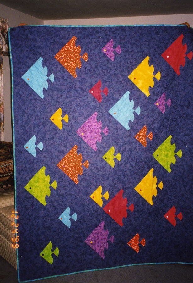 Patricia0330 Mathew's Fish - This quilt has large and small fish on a blue background with accompanying pillowcase of my own design with fish, starfish, and other sea creatures. The quilting is meandering with a series of round bubbles above each fish.