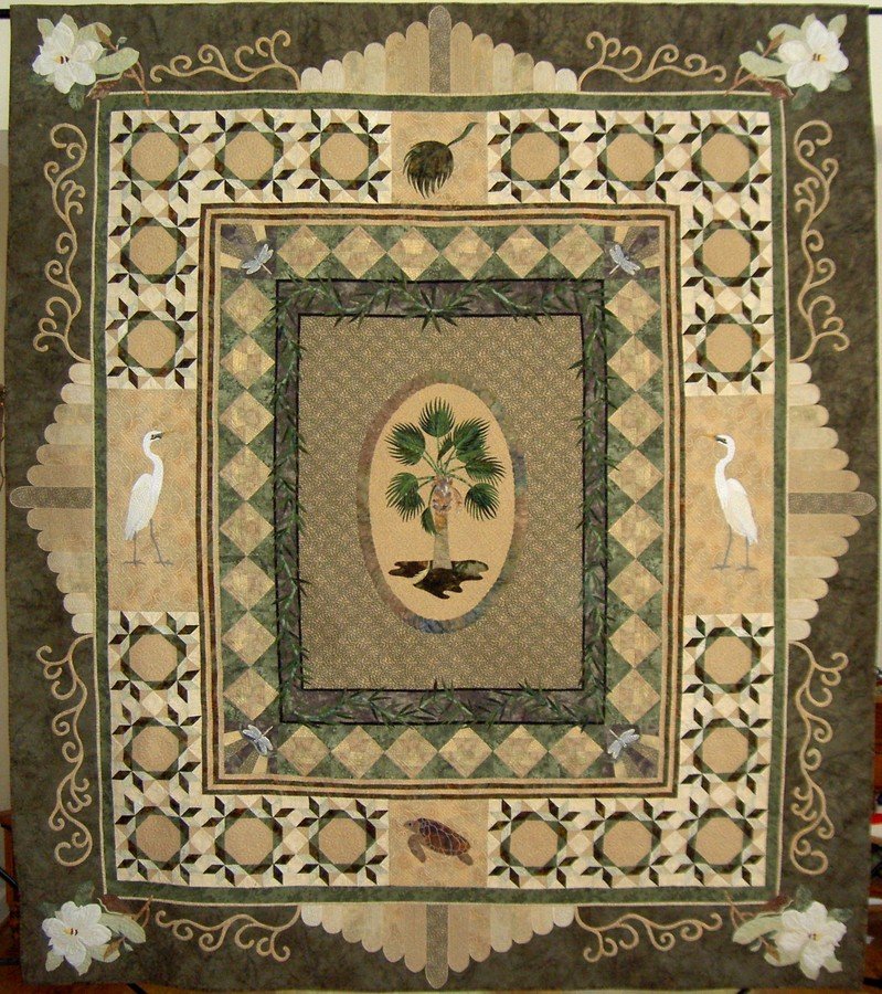needleturner Charleston Beckonings - The design of this quilt was original with 2 commericial components--the embroidered dragonflies and the egret pattern. Charleston Beckonings was created as a way of expressing my connection to the lowcountry of South Carolina--where I live. It is a way of acknowledging the things that are important and natural in the midst of continuous growth and change.