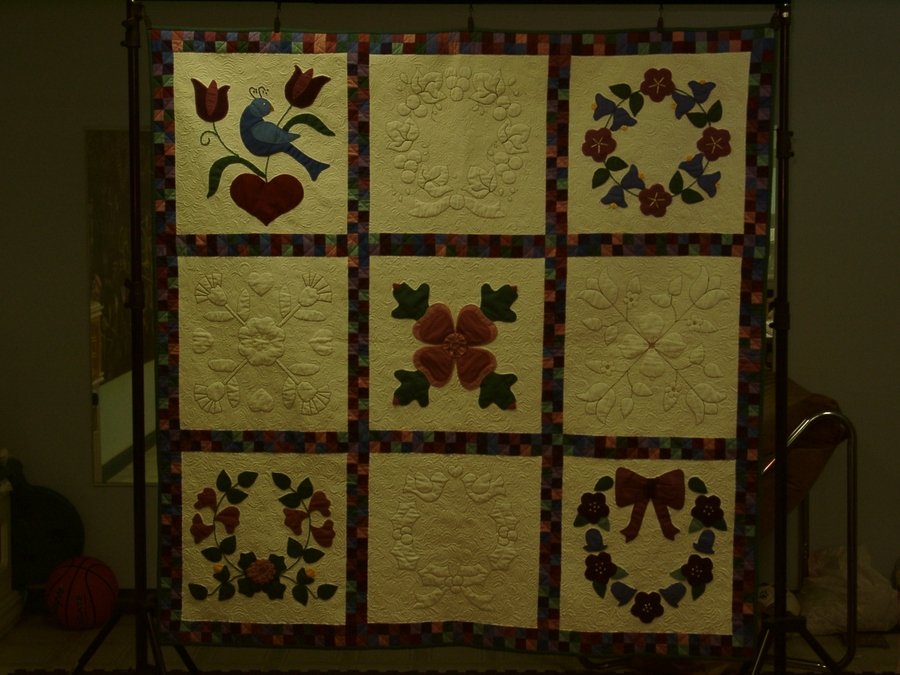 JanetLeeMQX Finished is a Good Thing ! - I began making the applique' blocks in probably 1997 as part of a Block of the Month at my local quilt shop. As it turned out, I decided in pretty short order that I wasn't all that thrilled about applique, even though it was being done by machine. So the blocks sat until I needed to "bid" on a machine quilting job and I needed to highlight my machine quilting skills. I dug out the blocks and with only 5 of them completed, I didn't have much of a quilt. I knew that I was not doing any more applique' so I did faux applique' with just machine quilting. For the border and sashing, I cut up the pieces of fabric which were originally to be used for the applique'. The machine quilting style is called "McTavishing" named after the extraordinary machine quilter and quilting teacher, Karen McTavish (www.designerquilts.com). I won the quilting job and Karen used the quilt in her book "The Art of McTavishing" by On Word Bound Books. The quilt has won numerous awards and now hangs in my quilting studio.