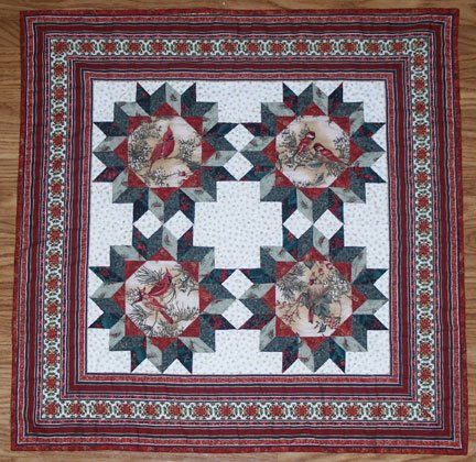 | Design Source - Description | Hand-pieced carpenter's wheel blocks surround fussy cut cardinals. Border is a border print. All machine quilted except for center square, which is hand quilted with a snowflake design. |