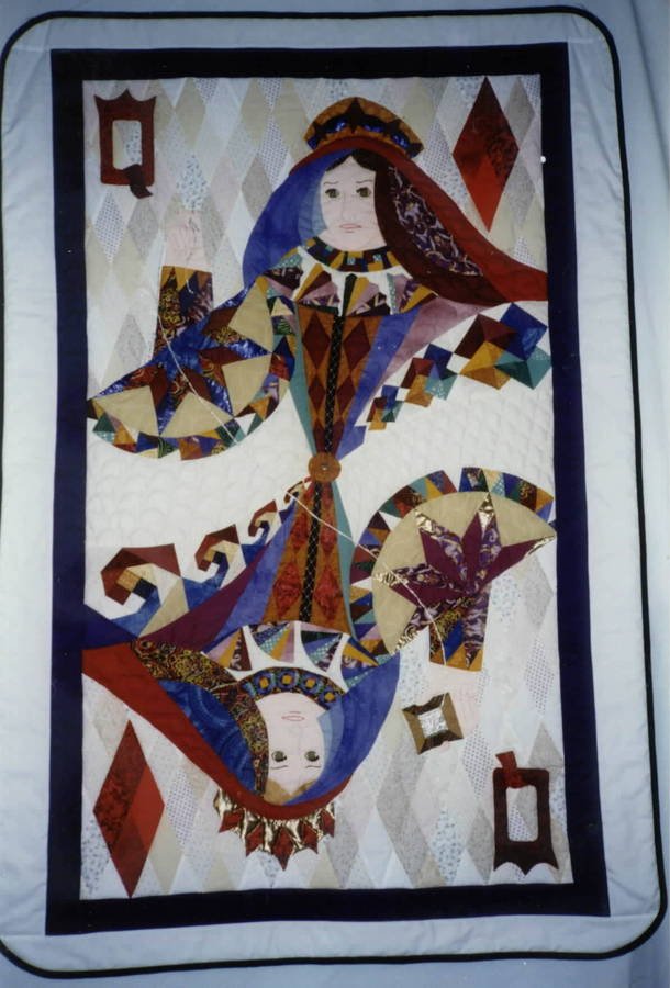 Feather Quilt Queen of Diamonds - Quilt Queen of Diamonds was made for a contest given by Viking Sewing Machines and JoAnn Fabrics. I won the grand prize -- a new Viking sewing machine. From that contest, I went on to teach, published a book for beginners on making a quilt from start to finish, travelled to some wonderful cities in the US and gave seminars and classes. This quilt changed my life. "Queen" enabled me to meet terrific, creative women who love quilting as much as I do. ....And I've done my share of passing on quilt pox to anyone not innoculated.