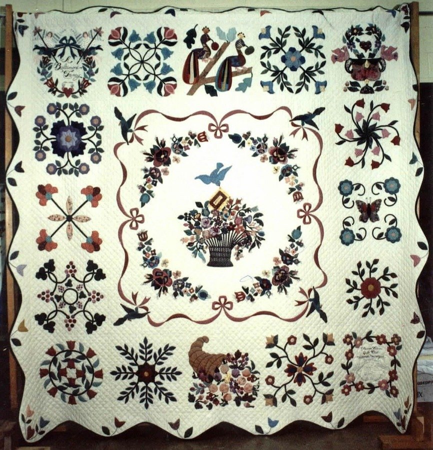 Feather A Baltimore Fancy - Our Walworth quilt group, Reverse Curves, used patterns adapted from Baltimore quilts along with some original designs. Baltimore Fancy was hand quilted in a one-inch grid. It was raffled at our quilt show to benefit the new local Ronald McDonald house. We raised over $7,000 - a donation larger than some corporate gifts that year. The quilt was won by a lady who hung it on the wall of her two-story staircase. A few years later, we were sad to find out that her roof leaked on the quilt. I still have the patterns and hope someday to duplicate it.