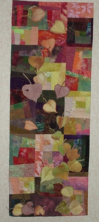 | Design Source - Description | Based loosely on log cabin, the final "block components" are sized with Fibonacci numbers. The appliqued leaves are setacolor painted cottonwood leaves from a nearby park. |