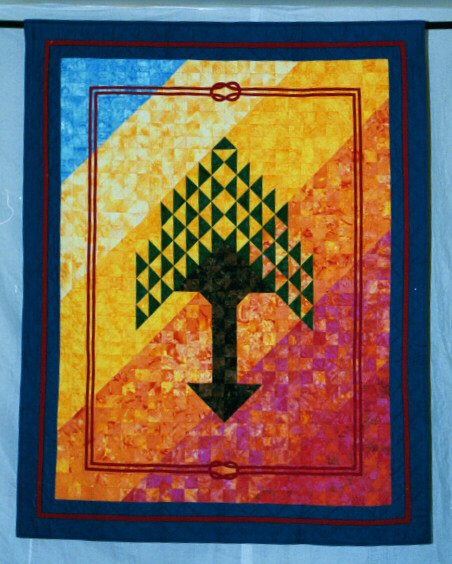 Ladybabe Family Tree - This quilt is a tribute to my family. I chose the tradition Tree of Life pattern, and used the colors of a rainbow as the background. The back of the quilt has all my family members represented by their hand prints which were traced on differefnt batik fabrics.