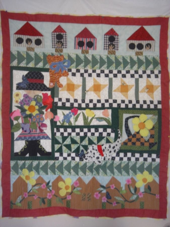 Dubblepink Olivia's Garden - I liked the design presented on the HGTV website as a block of the month, but it was too homogenous for me and I have a little Granddaughter named Olivia. So, my version is Olivia's Garden. I added baby birds in the bird houses and honeybees and butterflies with my Bernina Embroidery Machine. Then, I thought the quilt needed some drama, so I added a kitten hunting the baby birds and a puppy intimidated by a butterfly on his nose. I added some free-motion wood-graining to the fence at the bottom. Also tweaked the colors -- -- quite a bit, actually. It was fun!