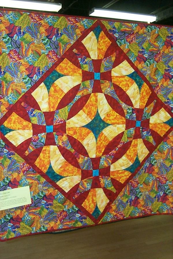 blk94vette Sunset At The Lake - This quilt was designed for the 2005 Hoffman challange but the hand quilting took too long for me to complete so it never got a chance to be entered. Now it hangs on my wall where I love to look at it. I spent my evenings sitting on the deck overlooking the lake we live next to as I hand quilted this. The colors are bright and bold just the way I like them. I used templates from Just Curves for getting the nice smooth curves and the curvemaster foot helped with the piecing. I changed the original pattern to move the quilt center on point, then I changed the colorization to enhance the flow of color through the center, and changed the borders to make better use of the challange fabric. A 2" sleeve on the back is used for hanging. It has been hung in one exhibition only.