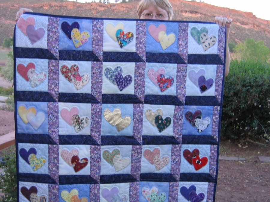 ritapawl Two Hearts of Gold (side 1) - I made this quilt to commemorate my cousins' 50th wedding anniversary. The fabrics in the windows represent the people who have come in and out of their lives. And it's reversible!