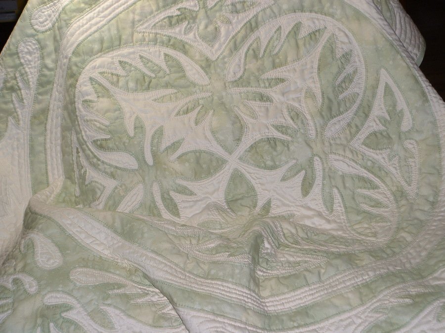 Starquilter Lei Nahele - A soft Fossil-Fern print on Cream Cotton Sateen....Started in late 2003 and then [put away due to moving, putting in yard etc...finished in 2006. This was made with a lot of love for my darling grand-daughter, Stella Melia...she is the light of my life.