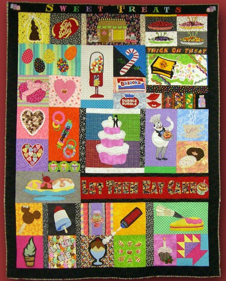 denise-nh Sweet Treats - I was in charge of our Guilds Challenge which was Sweet Treats. I took it a bit further than the 20x20 size and decided to make a rather large quilt that welcomed quilters to our "Sweet Treat" quilt show. A lot of the blocks were drawn by my husband Mark and the incredible quilting was done by a fellow guild member, Nancy Tatro.