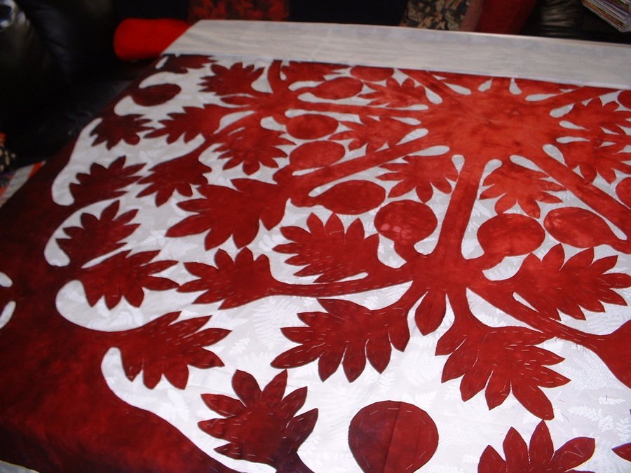 Starquilter Ulu - My current WIP---custom-hand-dyed cotton sateen that radiates from clear, bright red to a very deep burgundy....This was custom dyed by Jeanette Viviano of West Linn, Oregon. It took me 7 days to cut and baste this one, and another cuistom-dyed one that is original.... I hope to get all the needle-turn applique done this year...this will be held for Stella Melia...perhaps her Wedding Quilt? Not sure yet....