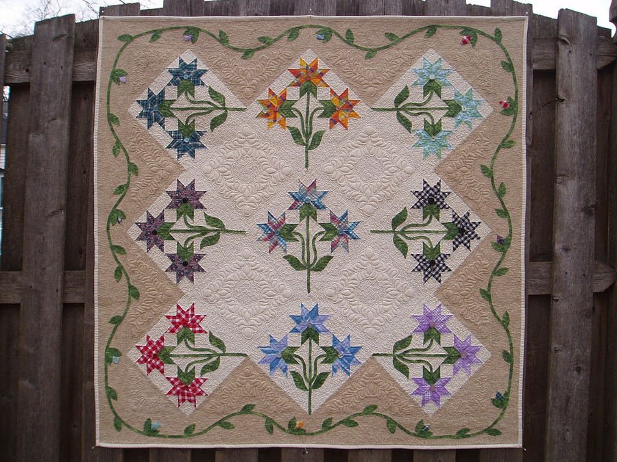 | Design Source - Description | This quilt was made using my late Grandmother's dresses as the flowers. This quilt is on the cover of my book "Scraps of Time" Quilting with Treasured Fabrics. |