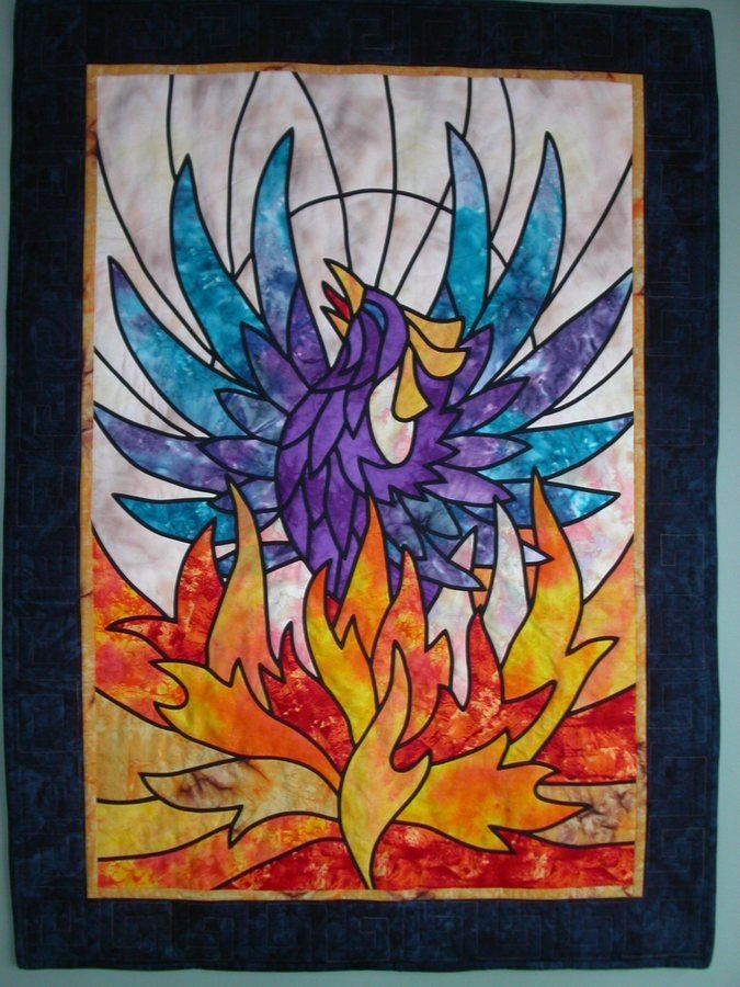 | Design Source - Description | The pattern is for reverse applique. I changed the procedure by using black bias tape to outline pieces. Some of the flames were hand dyed. This quilt hangs in my brand new kitchen every spring. |