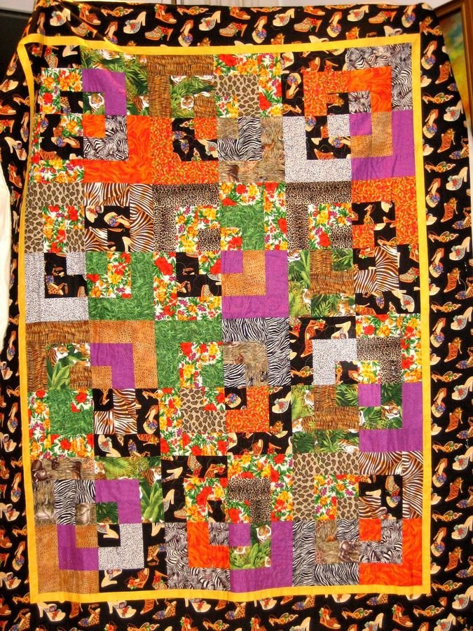 Darly Wild About Shoes - I made this quilt top for my niece who is wild about shoes. I added animal skin fabric and tropical flowers to the Alexander Henry shoe fabric which was my inspiration. The top is complete and quilted now. I need to replace with a new photo.