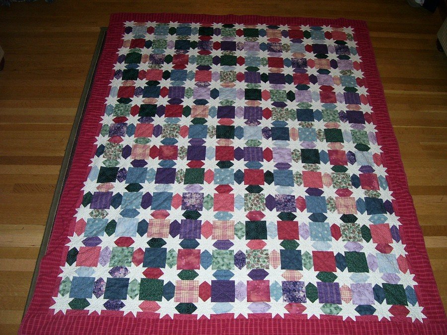 JennieStreet Scrappy Star - I made this quilt for my sister for Christmas in 2005. My color palate was chosen from a Cross-Stitch Pattern I did for her also. The Cross-Stitch Pattern is by Lavender and Lace and it is called Fairy Dreams (L&L 41).