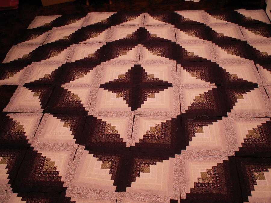 ease2802 Curved Log Cabin - I took a class in Lockport, NY and completed this quilt based on the instructions from the teacher. What I originally brought to the quilt, was a bobbin embroidery technique in the center blocks and around one of the curves, for which I used a Bernina Embroidery CD--Linda Grabrowski? and Ricki Tims thread--Razzle Dazzle. The second picture shows the embroidery in the center. The quilting is a giant stipple with feathers