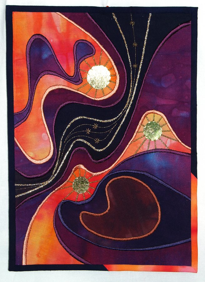 Strawbs Twinkle Twinkle - Design expanded around a 1 inch square taken from 'Inspiration Odyssey' by Diana Swim Wessels. Bonded applique. Machine satin stitching and machine embroidery stitching using rayon and metallic threads. Felt batting.