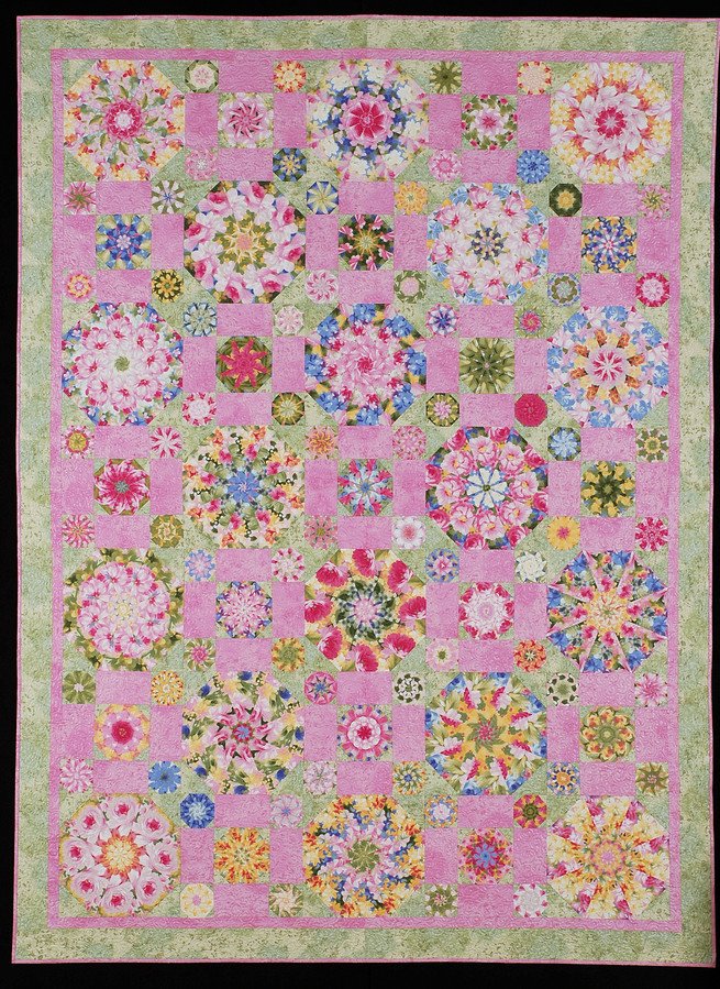 Pattiwatti "Stop and Smell the Rose Garden" (1st place) - Michael Miller's wonderfully delicious pink pastel floral fabric seemed the perfect piece to inspire creation of this 86 x 64" 103-kaleidoscopic garden of roses entitled "Stop and Smell the Rose Garden." It was entirely pieced and quilted by me on my Bernina 440-QE. The original design is Linda Causee's "Wacky Wedge". I adore it so much that I've made 7 of them! I am very proud to say that this quilt was juried into the Denver National Quilt Festival's "Peak of Perfection" May 3-6, 2007 and won a 1st place Blue Ribbon at the New Braunfels Area Quilt Guild Quilt Show here in Texas at "Stitchin' in the Garden" July 21-23 2006.
