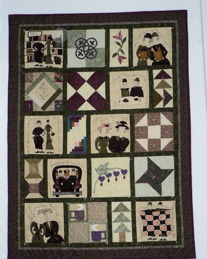 QuilteeLady Friends Quilt - My friend Diane and I each made a "Friends Quilt" from sampler blocks and a purchased panel. The sampler blocks were chosen to reflect our friendship.