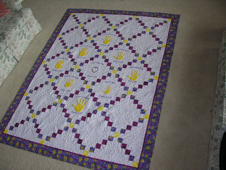 | Design Source - Description | Center Block is Grandma and Grandpa's names and wedding date. Handprints of all the grandchildren with their names and birthdates. Grandma has severe macular degeneration so hands are trapunto'd. |