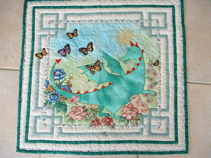 Brenda Desmond learning to fly - My Granddaughter had a story she loved me to read to her. Desmond was a poorly young dragon. He had bumps on his back that hurt and his Mummy called the doctor. Next morning he was feeling better but he had these funny things on his back - his Mummy laughed and said they were wings and sent him into the garden to learn how to fly, the butterflies said they would show him how. The quilt group I belong to gave us a challenge to use a given piece of fabric in a quilt no bigger that 24" Square so my desmond was born - the challenge fabric is in the celtic border, it's the one with flowers. The background was painted and the flowers and butterflies are Broiderie Perse. The sun is aceltic knot embroidered over the painted sun. this quilt won a Merit for original design at the quilt show put on by my group later that year.