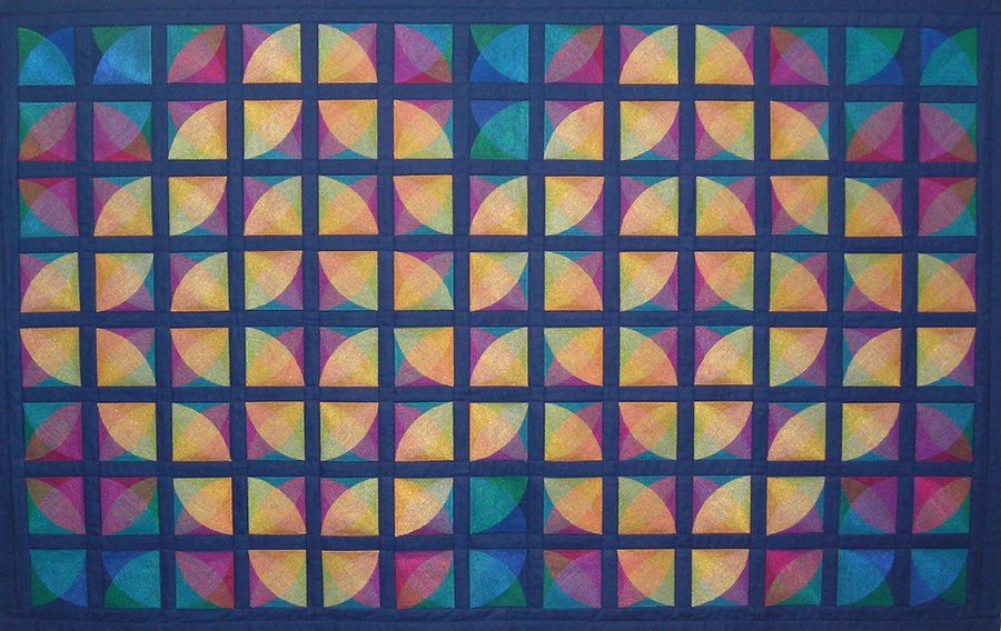sylvainber Tied In Knots - My first award winning quilt. Second in a series of design studies showcasing line and color in abstract geometric forms made entirely of embroidered thread, two intertwining loops crisscross each other in what appears to be a perpetual movement. The spacing of the lines allows the layers of color to show through in a translucent and dynamic effect. Multiple underlying patterns form under the main design element, creating an ever-changing picture based on the viewing angle. The overall effect suggests ropes tied in knots.